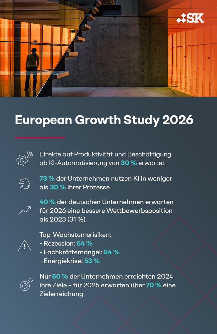 Die European Growth Study 2026* der globalen Strategieberatung Simon-Kucher zeigt: Künstliche Intelligenz (KI) bleibt bei den meisten Unternehmen noch unter der Wirkungsschwelle – doch das könnte sich bald ändern. Ab einer Automatisierung von rund 30 Prozent erwarten Firmen erstmals spürbare Effekte. Gerade in Zeiten des Fachkräftemangels stehen deutsche Unternehmen an einem Wendepunkt zwischen Effizienz und Skalierung: Nach einem schwierigen Jahr 2024 überwiegt für 2025 wieder Zuversicht. Für 2026 rechnen viele mit stärkerer Wettbewerbsfähigkeit und stabilem Wachstum im Einklang mit der Gesamtwirtschaft.