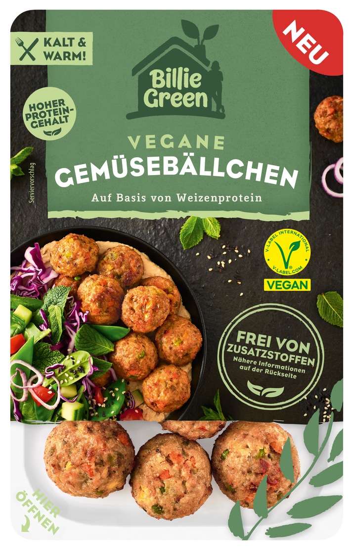 Erbse, Karotte, Paprika und Mais? Ja bitte! Billie Greens vegane Gemüsebällchen sind eine Antwort auf die wachsende Nachfrage nach natürlichen, rein pflanzlichen Alternativen ohne Imitate – und haben mit 54 % den höchsten Gemüseanteil im vergleichbaren Wettbewerb am Markt. Mit ihrer neuesten Produktinnovation, die ab Oktober im Kühlregal sein wird, setzt die Marke Billie Green erstmals auf ein Produkt ohne Fleischersatz-Optik – dafür aber mit vollem Geschmack. Für die Extraportion Protein sorgt hochwertiges Weizenprotein.