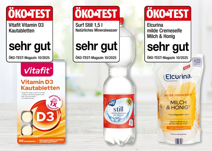 Kontinuierliche Verbesserungen zahlen sich aus: NORMA überzeugt in der aktuellen Ausgabe des Verbrauchermagazins ÖKO-TEST mit gleich mehreren ausgezeichneten Produkten. Bestnoten erhalten das stille Mineralwasser der Eigenmarke SURF, die Vitamin D3-Kautabletten von VITAFIT sowie die ELCURINA Cremeseife – sie wurden von den Expertinnen und Experten jeweils mit „sehr gut“ bewertet.